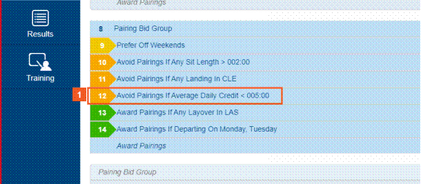 As discussed, order is important; the system considers any bid preferences listed above the one you create first. For this example, insert another line underneath line 12 to enter a preference for Enroute Check-In Time.