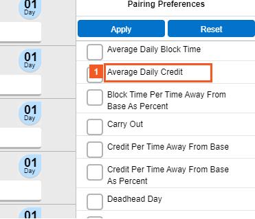 Use a filter to identify pairings you may want to fly based on a high Average Daily Credit.