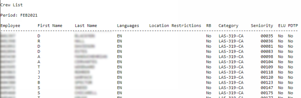 All crew members in the selected category are listed. This report has been sorted by seniority, but other options are available.