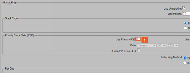 The primary stack date (PSD) is used to prioritize unstacking for a holiday. For this example, February 14th, Valentine's Day, will be used to ensure sufficient coverage.