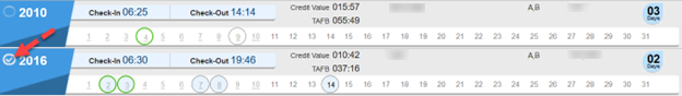 6. Click the circle beside a pairing number that you want to bid for. You can select one or multiple pairings. Notice that the background on the circled dates in pairing number 2016 has a different color than pairing number 2010. This indicates that you can click select it. The green circle indicates that it matches the search criteria.