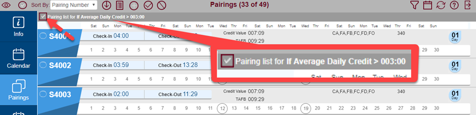 Note: You must have the Pairing On Dates bid to add a pairing on date from the Pairings screen. You don't have the bid, you can't click on a pairing on date.