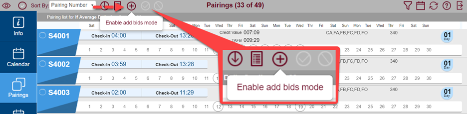 4. Click on the red plus button beside the gray Award and Avoid buttons in the top menu bar to enable Add Bids Mode. The bids are added to the Start Pairings bid group.