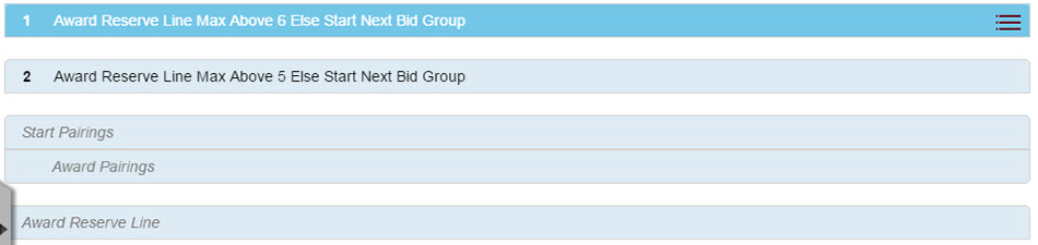 This bid cannot be submitted because it contains two Award Line Reserve bid groups and the first one does not contain an Else Start Next Bid Group option. If you have multiple bid groups of the same type, either Pairing or Reserve, all bid groups except for the last one must have this bid. See Else Start Next Bid Group for more information on how to use this bid.