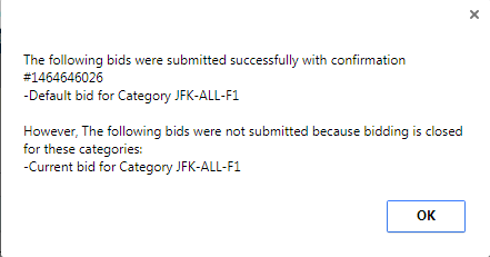 A crewmember can edit both their Current and Default bid in the Web App when bidding is closed. However, only the Default bid can be submitted. If a bidder submits a bid when bidding is closed for their category, they will see the following message.