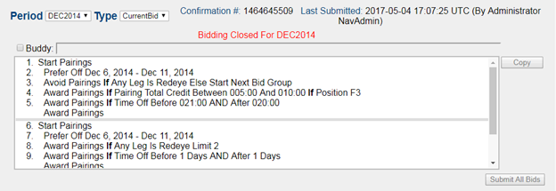 If a crewmember logs into the Web N-PBS Bidder when bidding is closed, they will see a Bidding Closed message on the interface when they select the Current Tab. A bidder cannot edit their Current bid when bidding is closed. The buttons to submit and edit bids will either be disabled or will not appear on the screen. A bidder can copy their Current bid.