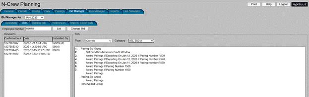- Click the List button. The N-PBS Scheduler displays a list of the bid revisions this Crewmember has submitted.
