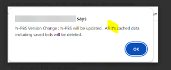 "There has been a N-PBS Version Change: N-PBS will be updated and all of the cached data including saved bids will be deleted. Submitted bids will NOT be impacted."
