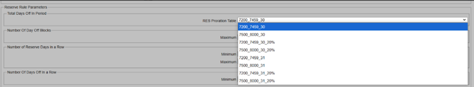 We enhanced the configuration of reserve rules by introducing a mixed line specific proration table under Configuration > Rules > Reserve-TotalDaysOff. This is similar to the existing RBP configuration (shown in below image).