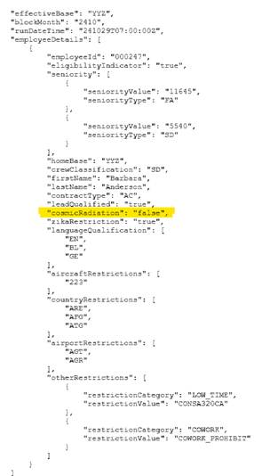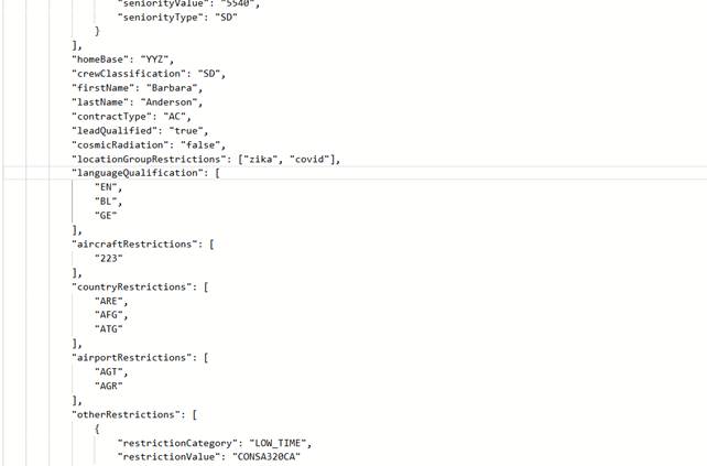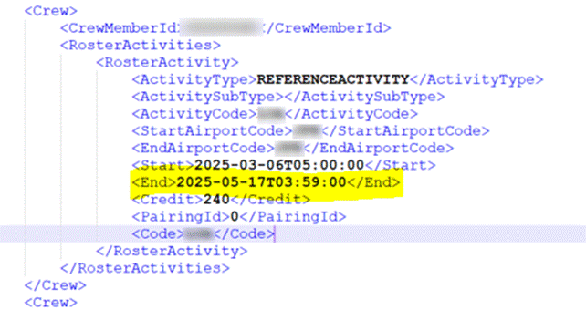 - If a crew member has an <SpecialQuals> element with the value SQ: They are assigned to a new, language-qualified category. For example, a crew member in the BOS-320-CA category is re-assigned to the BSQ-320-CA category.