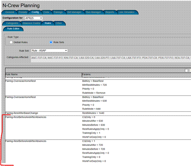 THEN - I will see the Pairing-DomicileRestWithTable rule, in both rule sets (for Pilot and Cabin), with the following configuration: