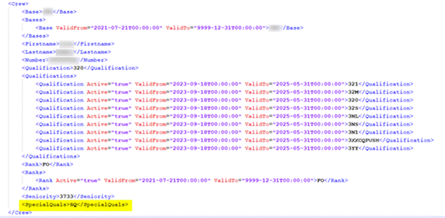 - If the crew member does not have this element: Their category will remain unchanged. For example, a crew member in BOS-320-CA without the <SpecialQuals> element will remain in the BOS-320-CA category.