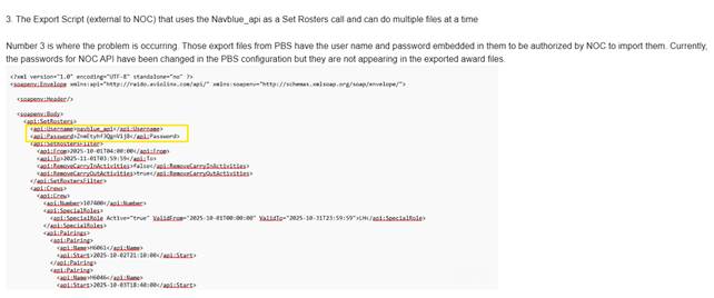 Fixed an issue where the Raido Crew Roster Export was using hardcoded API credentials. The system now correctly references the RAIDO API USERNAME and RAIDO API PASSWORD values defined in your /navtech/parm/NAVNWSParams.xml file, allowing for flexible configuration across different environments.