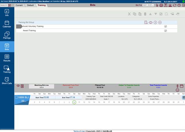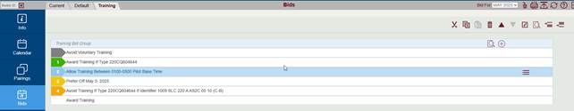 Fixed a restriction that prevented certain bid sequences in the Training tab. Users can now successfully add a Waive Training line immediately following an Award Training line to better refine their bid priorities.