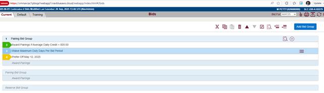 Fixed a bug that prevented the Apply button from enabling during certain Prefer Off bid edits. This correction ensures that the button properly activates as soon as valid modifications are detected in both Pairing and Reserve Bid Groups.