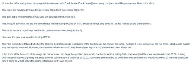 Fixed an issue where the Bid Analyzer and Pairing Search were using "inclusive" time logic, while the Scheduler was using "exclusive" logic.