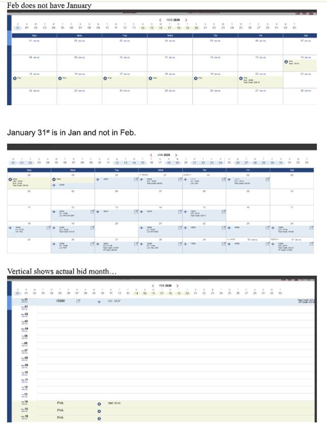 Fixed a bug where the Traditional Calendar view failed to display carry-in and carry-out dates. The view has been corrected to render the full bid period range (e.g., late January through early March for a February bid) instead of strictly adhering to the calendar month, ensuring Jan 31st is visible by default.